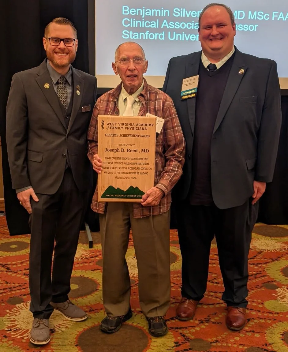 The Academy also presented its first-ever WVAFP Lifetime Achievement Award to Dr. Joseph B. Reed, a Past President of the WVAFP, honoring his extraordinary career and lasting contributions to Family Medicine in West Virginia. Over more than six decades of practice in Buckhannon, Dr. Reed cared for generations of families and became a trusted physician, mentor, and community leader. Even after retiring from clinical practice, he has remained actively involved in community service and advocacy for health care in the region.